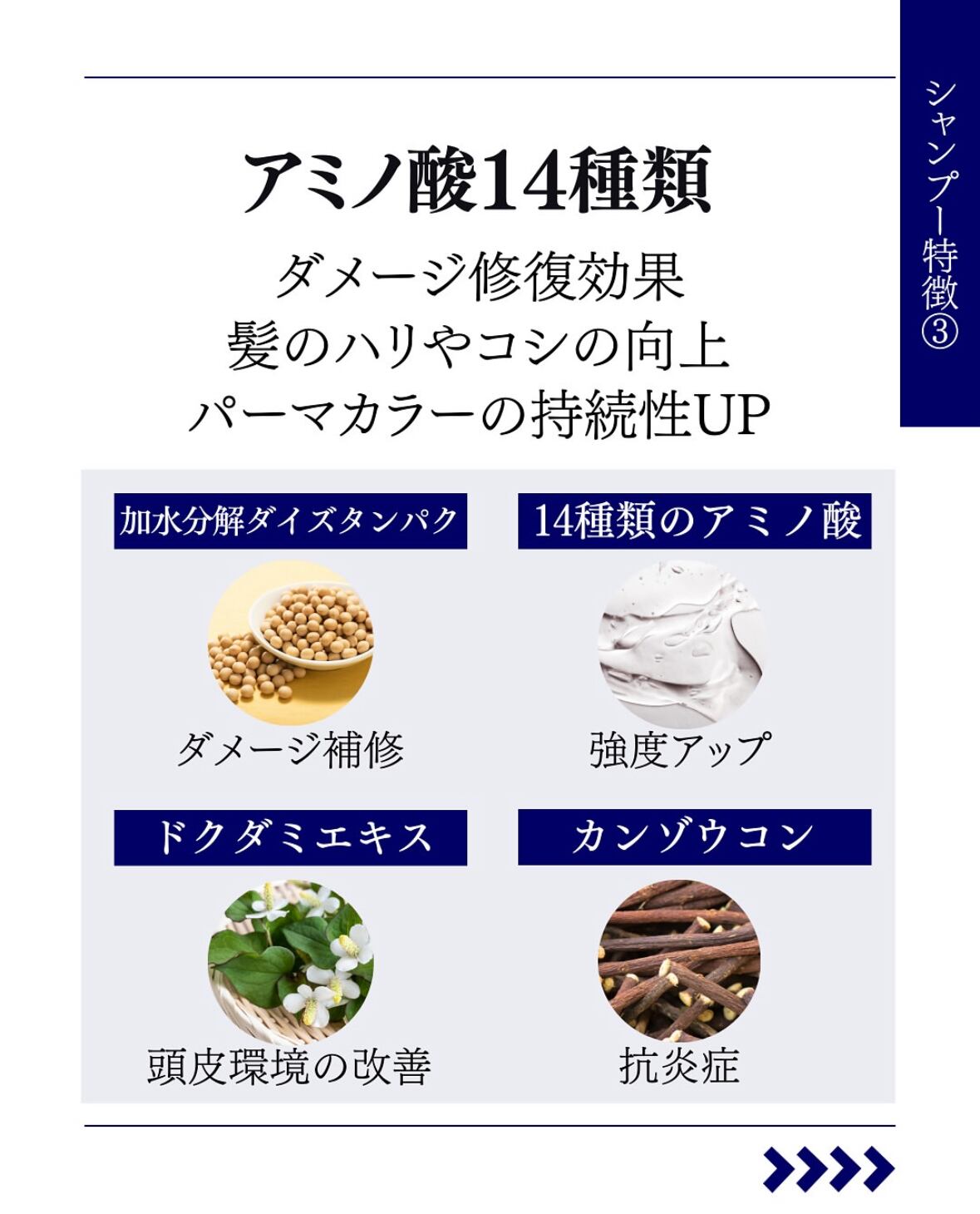 髪の主成分であるケラチンを組成する14種類のアミノ酸に加え、頭皮のエイジングケア成分もしっかり配合した、健やかな頭皮と豊かな髪を育てる贅沢なシャンプーです。