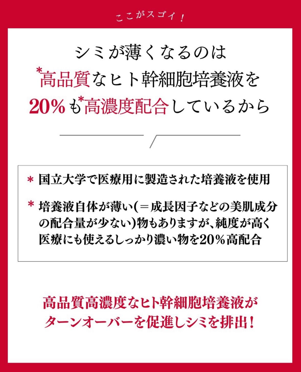 国産で品質の高いヒト幹細胞培養液を限界値に近い20%で配合。