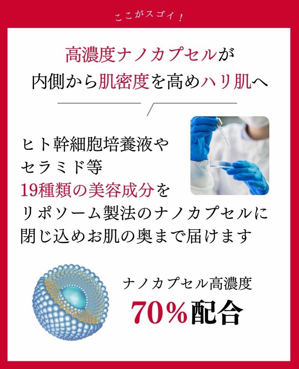 美容成分を閉じ込めたナノカプセルを70%も配合したスペシャルクリーム。内側からギュッとハリを高め、すっきり引き締まったファイスラインへと導きます。